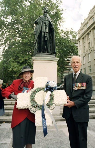Odette in her later years with one of her fellow Second World War heroes – Air Vice Marshal Sir Laurence Sinclair – laying a wreath of remembrance at the King George VI statue in Carlton Gardens, London. There, as George Cross recipients, they led a memorial service commemorating the 50th anniversary of the medal’s founding in September 1940.