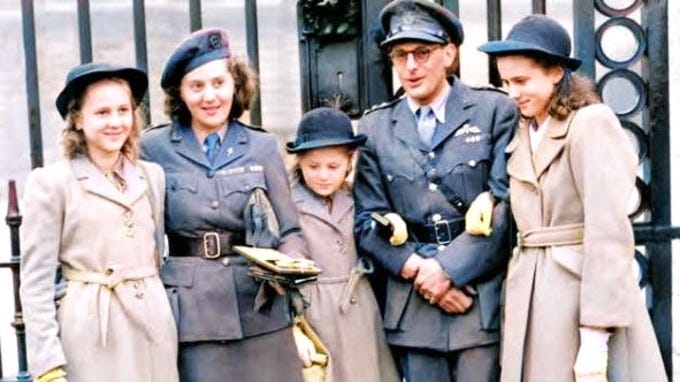 Odette pictured with her beloved daughters and then-husband – Captain Peter Churchill DSO – shortly after being bestowed her Geoge Cross at Buckingham Palace.